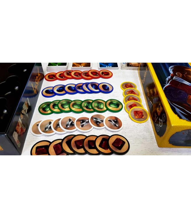• ۴۰ ژتون پلاستیک فشرده با عکسهای جواهرات شامل ۷ ژتون از هر رنگ جواهر (۷×۵) به همراه ۵ ژتون طلا (با رنگ زرد)