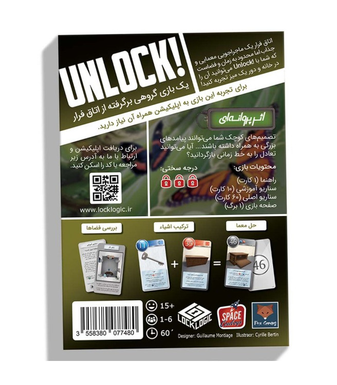 آنلاک! يک بازي کارتيِ همکاري مشترک و برگرفته از اتاق فرار است. در اين بازي شما بايد فضاهاي مختلف را جست و جو کنيد، اشياء را با هم ترکيب کنيد، با همکاري يکديگر معماها را حل نموده و مراحل بازي را با موفقيت بگذرانيد.