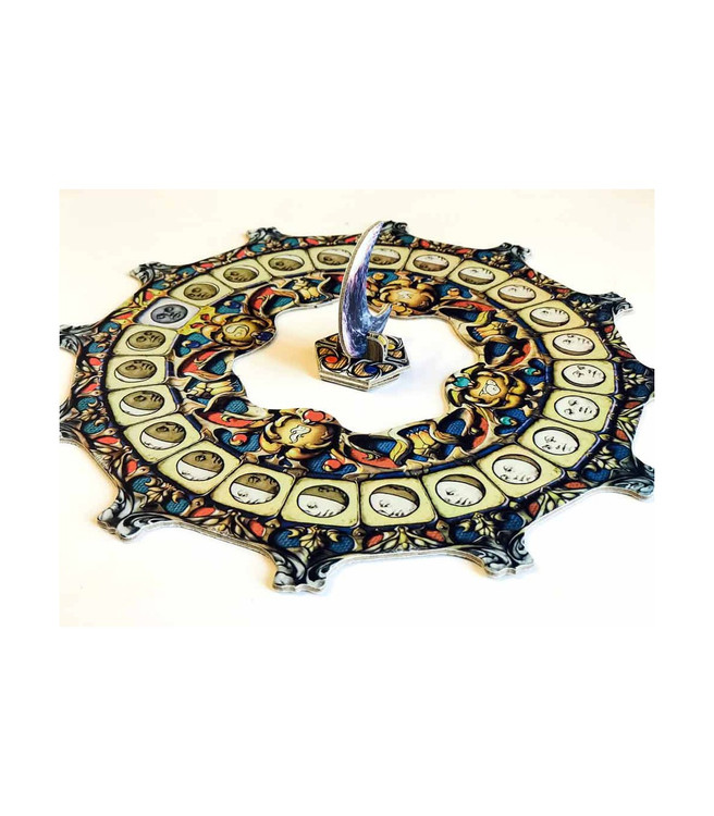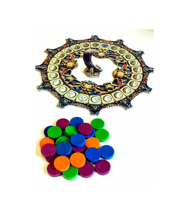6) ترتیبِ اوّلیهی نوبتها را مشخّص کنید. برای این کار، هر بازیکن، یکی از توکنهای خود را در وسط محوطهی بازی میگذارد؛ بازیکنی که "شبها از همه دیرتر میخوابد"، با چشمهای بسته، شروع به برداشتنِ توکنها میکند. این توکنها را مثل یک ستون روی هم بچینید؛ توکنی که اوّل برداشته شده، در زیرِ ستون و توکنی که آخر از همه برداشته شده، در رأسِ ستون؛ ستون توکنها را در خانهی "ماه نو" از "ردیف ماه" بگذارید.