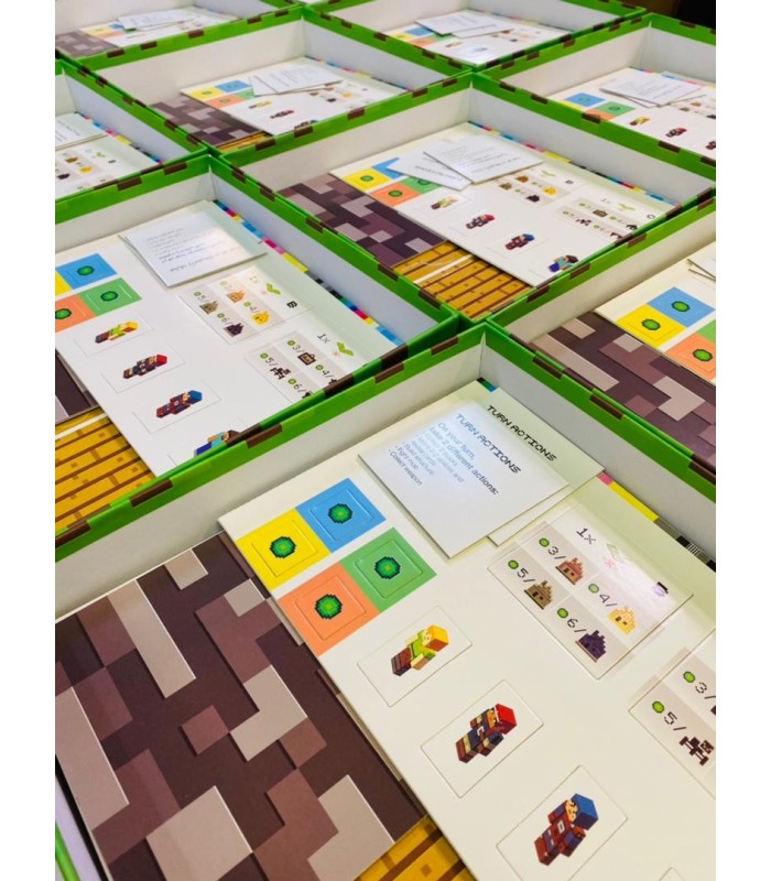 انبار بلوک ها را در نزدیکی زمین بازی و در دسترس همه ی بازیکنان قرار دهید. ابتدا دیواره ها را به هم متصل کرده و آن را بر روی صفحه ی زیرین بلوک ها قرار دهید. حالا فضای ایجاد شده را به صورت رندوم با 64 بلوک بازی شامل: 16 بلوک چوبی (قهوه ای)، 14 بلوک شنی (کِرِم)، 12 بلوک سنگی (خاکستری)، 10 بلوک آبسیدین (مشکی) و 12 بلوک زمردی (سبز) پر نمایید. سازه را به آرامی تکان دهید تا تمام بلوک ها روی هم قرار گرفته و یک مکعب بزرگ را تشکیل دهند. سپس دیواره های اطراف را بالا بکشید تا انبار در دسترس همه قرار گیرد.