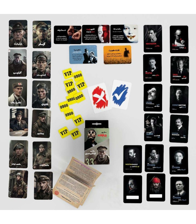بازي فکري مدل ارتش سري داراي 12 کارت بازي و 12 کارت مخصوص اتاق گفتگو ميباشد ( 3 کارت تيم گشتاپو ، 5 کارت تيم نجات ، 2 کارت مستقل (مشتري) ، 12 ژتون اتاق مخصوص ، 2 کارت بي نام ) مجموعه کارتها براي بازي 12 نفري به همراه گرداننده به روش سناريو ارتش سري فيليمو طراحي و توليد شده است . براي آموزش روش بازي و توضيح نقشها ، برگه راهنما درون محصول مفصل توضيحات را ارائه ميدهد ، قصد اوليه طراحي و توليد اين محصول صرفا کمبود کارت کامل و مقرون به صرفه در بازار بود ، در نتيجه پس از استقبال علاقه مندان و دريافت نظرات متعدد ، اقدام به توليد اين محصول نيز نموديم . جنس کارتها لمينيت دورو چاپ با روکش سلفون مات بوده که مقاومت آنها را چند برابر مي کند