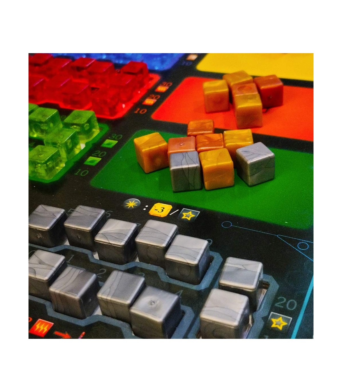 فولاد: نشانگرِ مصالح ساختمانی بهکاررفته در مرّیخ است. هر ظرفیت فولاد، هزینهی بازی کردن هر کارت پروژهی دارای برچسب ساختوساز (@) را 2MC کاهش میدهد.