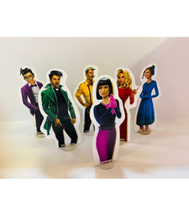 6 تا توکن شخصیت /21 کارت سرنخ (سیاه رنگ) / 13 تا کارت پاداش (قرمز رنگ) / 6 تا توکن آلت قتل / 2 تا تاس
